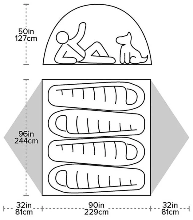 Het ontwerp van de Blacktail 4 is doordacht. De buitentent is niet te hoog uitgesneden zodat de buitentent tot dicht bij de grond reikt. In combinatie met een solide hoogte van het dichte gedeelte van de binnentent, maakt de Blacktail 4 een prima tent voor 3 seizoenen. Het hoger geplaatste mesh in de binnentent zorgt wel voor een super ventilatie in warme omstandigheden, zeker in combinatie met de 2 hooggeplaatste ventilatie opiningen in de buitentent. Condens zal hierdoor bijna niet optreden. De binnentent is bijna vierkant. Met een 229 cm breedte en 244cm lengte, heeft Big Agnes deze tent bedacht als dwars-slaper. Maar met drie personen zal je de Blacktail 4 eerder gewoon als lengte-slaper gebruiken, maar dan wel met 244cm hoofdlengte. De luifels net net iets breder van bij de kleinere varianten uit de Blacktail serie met weerszijden 81cm luifelruimte. De Blacktail 4 is een nog steeds een lichtgewicht tent, maar met een gewicht van 3,54kg kies je meer voor het comfort, dan een echt laag gewicht. Deze veelzuidige 4 persoonstent zal met name veel motorrijders en actieve auto kamnpeerders heel gelukkig maken.