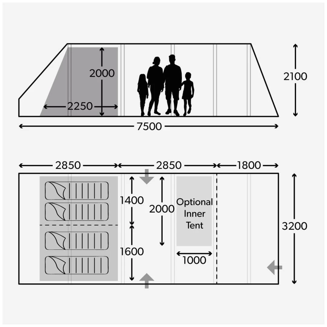 De tent biedt slaapruimte aan 4 personen. Er kan optioneel nog een losse slaapcabine worden ingehangen, zodat er 5 personen in de tent kunnen slapen.