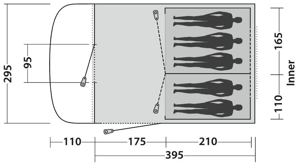 Sleeping five in two bedrooms, the Palmdale 500 has a front and a side door for flexible access. With colour-coded fibreglass poles and pole sleeves, youll find it fast and easy to pitch. A sewn-in groundsheet cuts out draughts whilst curtained windows in the living area let light flood in. The deep canopy over the front door, with mesh insect screen, and windows offers extra shelter for access, cooking and storing bikes..
