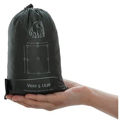 Voss 5 ULW tarp is one of the world’s lightest portable shelters. Although the flysheet weight is only 170 grams, no compromises have been made in regards to functionality. It has a total of 8 attachment points; one at each corner, one centred on each edge, plus one centred on the top side of the flysheet.