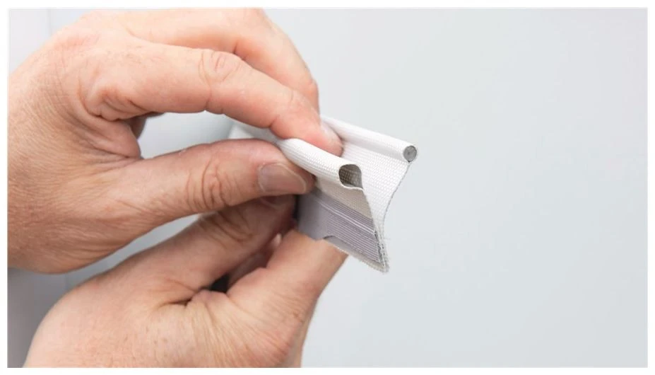 Een opvouwbare vooringang is voorzien van insectenwerend gaas onder een ronde luifel.