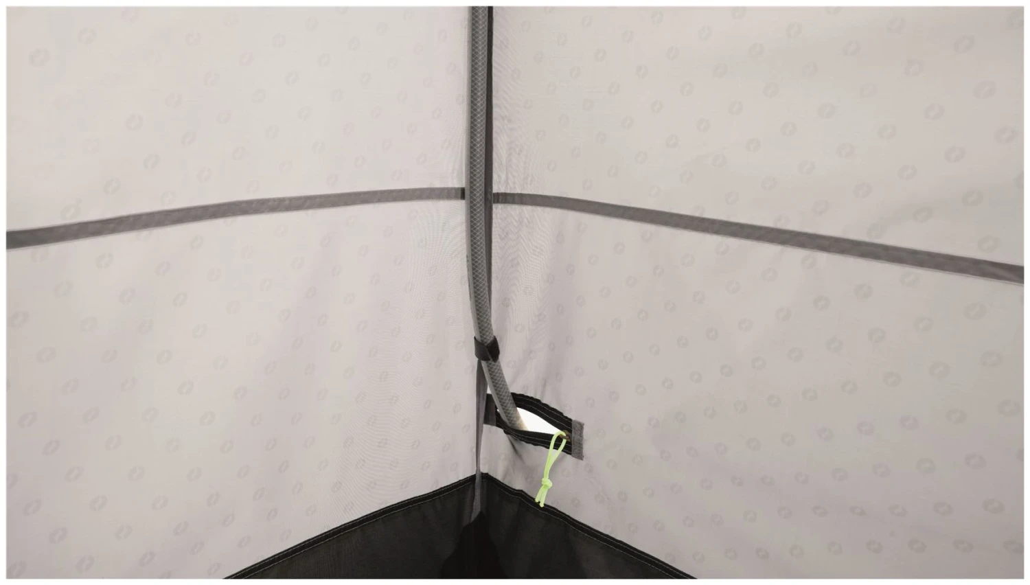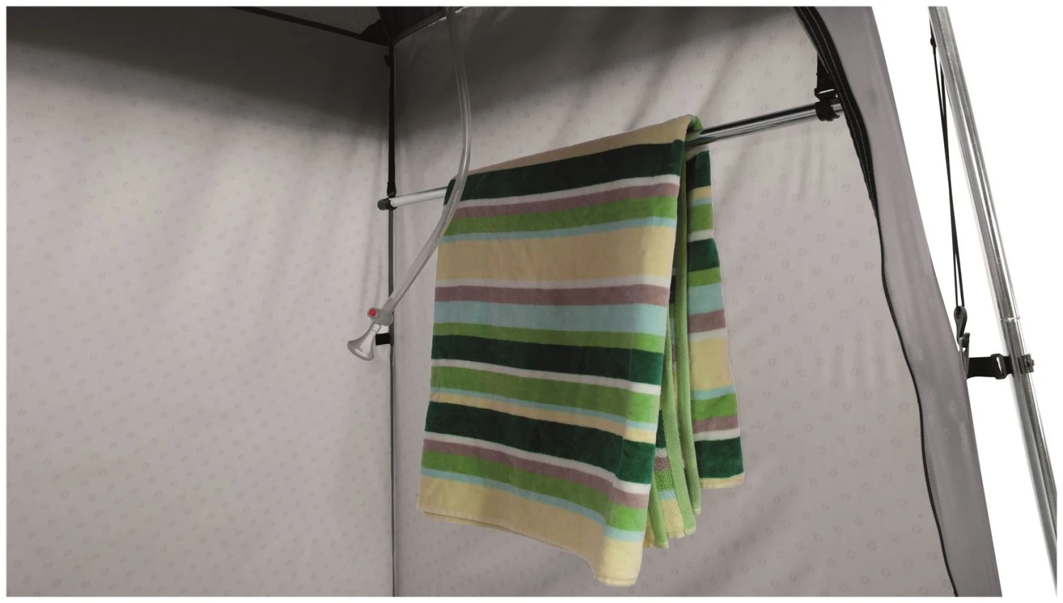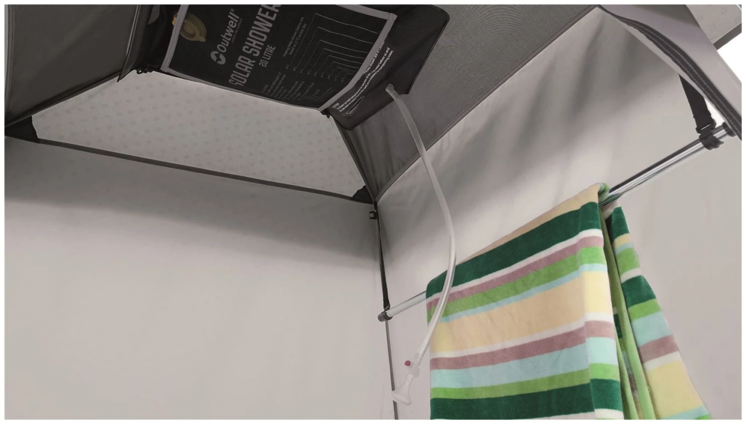 Bringing convenience to the pitch. This double toilet tent offers the facility to discretely house a chemical toilet or for changing once youve left the separate shower room. This room features a hammock for an optional Outwell shower bladder, which sits under a vinyl roof window so the suns rays heat up the water.