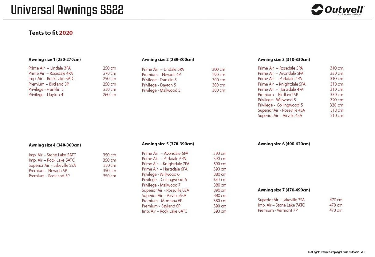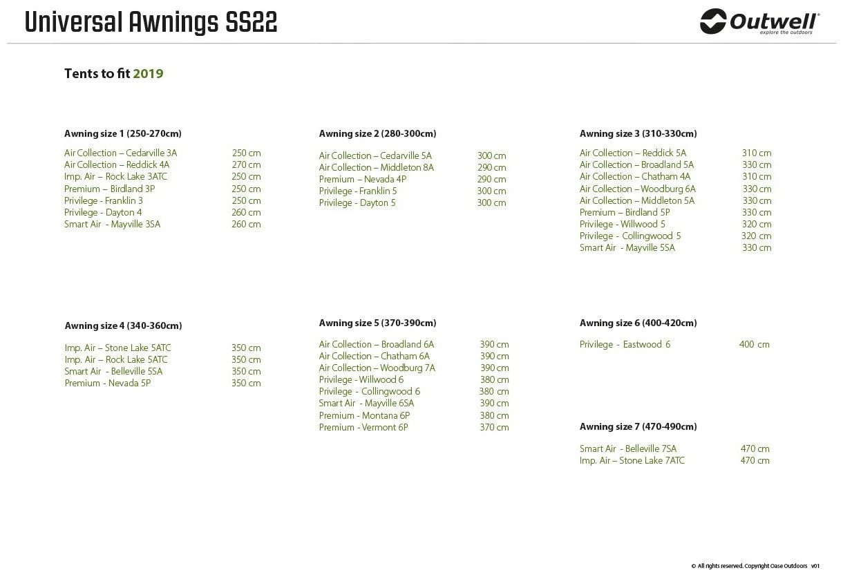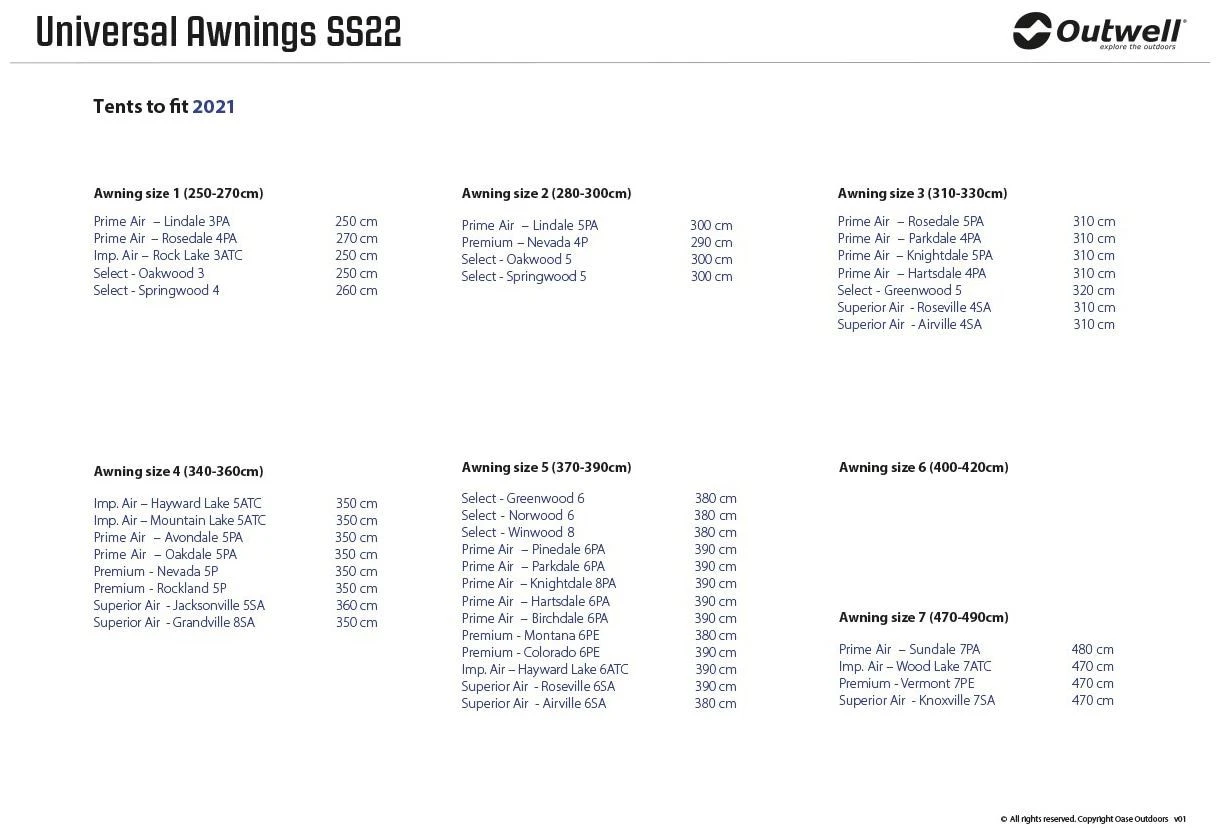 Designed to fit all Outwell inflatable and poled tents (except Encounter tents), you can easily extend yours with an Outwell Universal Awning. As superbly engineered and carefully crafted designs, each is easy to attach so you can quickly add sheltered space to your living area for relaxing or to use it as storage.