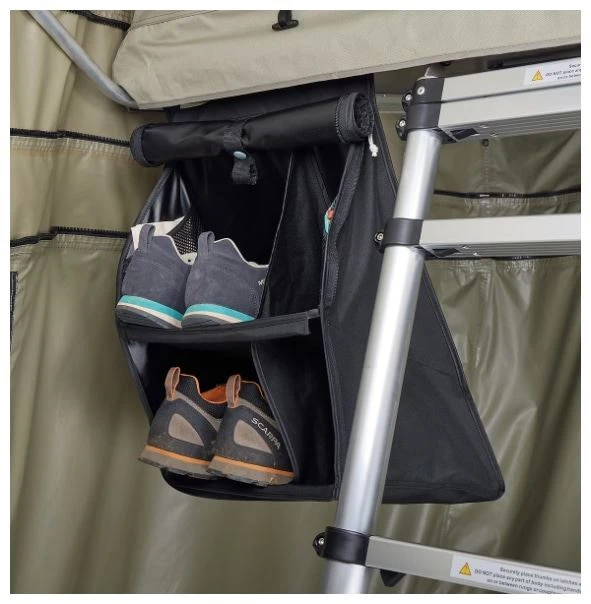 Houd de binnenkant van uw tent schoon en droog door schoenen en laarzen buiten de tent te hangen. Met vier verschillende opbergvakken is de Thule Rooftop Tent Organizer verdeeld in twee grote opbergvakken voor laarzen of schoenen en twee kleinere vakken voor kampeerspullen.