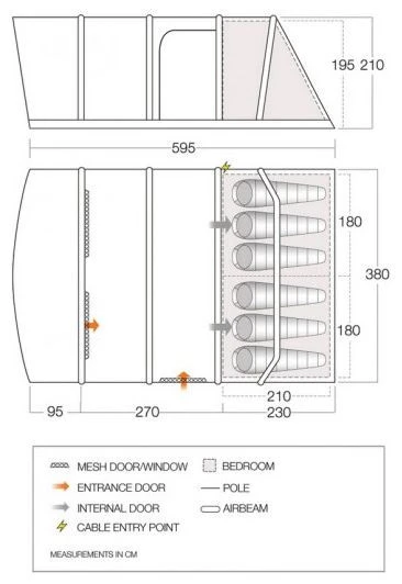 - Opblaasbare AirBeams, zodat tentstokken niet nodig zijn. AirBeams zijn zacht, waardoor de zijkanten van de caravan niet beschadigen. Wordt geleverd met een dubbele cilinder pomp.